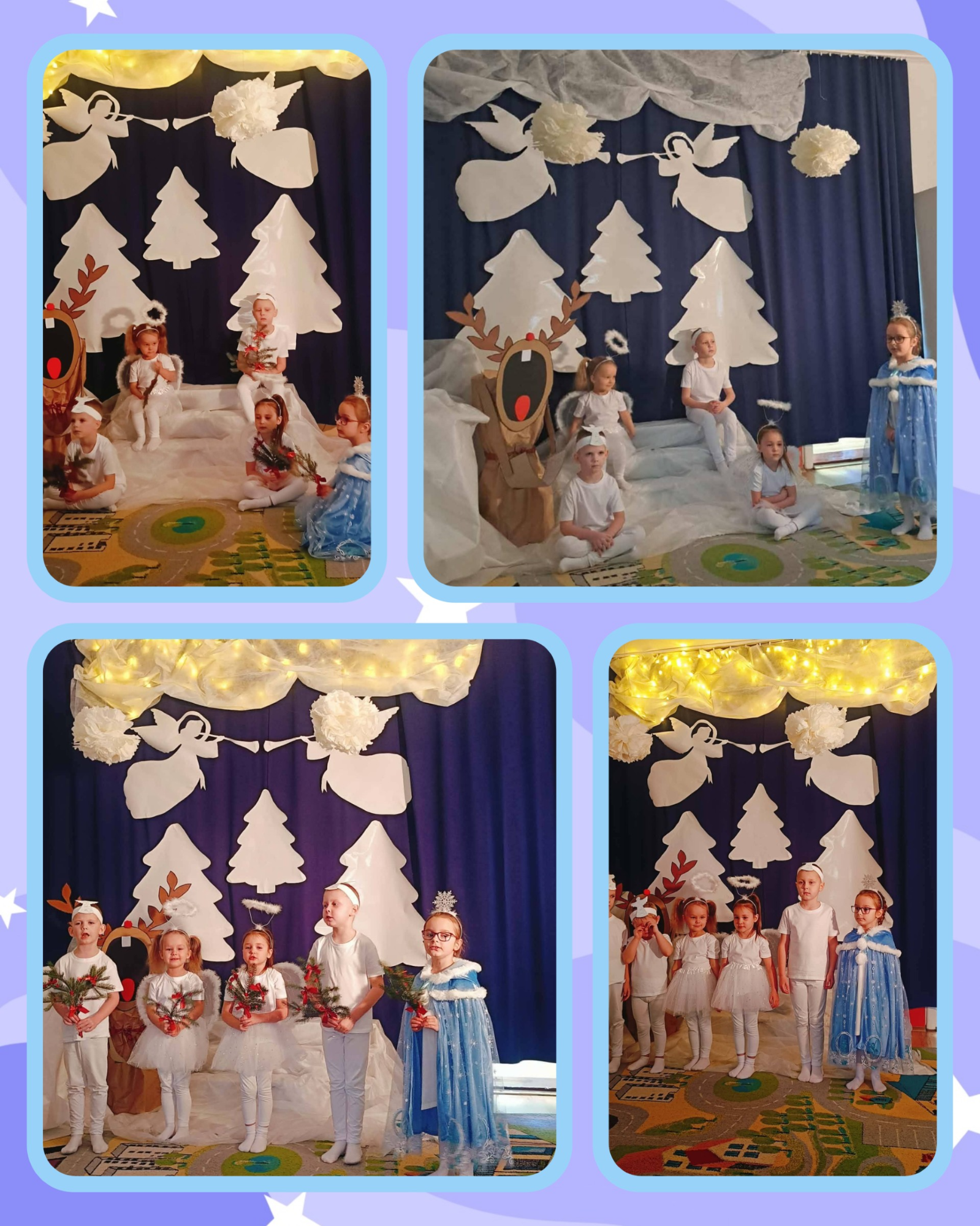 Dzisiaj w naszym przedszkolu odbyło się wyjątkowe spotkanie. Dzieci zaprosiły swoich rodziców, aby wspólnie zatrzymać się na chwilę w tym przedświątecznym czasie i poczuć jego klimat. Przedszkolaki zaprezentowały przedstawienie „Aniołki w poszukiwaniu choinki”. Na scenie pojawiły się aniołki oraz pani Zima, która pomogła im w tej zimowej przygodzie. Była to opowieść pełna ciepła, dziecięcej radości i świątecznego nastroju. Po występie odbył się poczęstunek, który dopełnił to spotkanie i pozwolił jeszcze przez chwilę pobyć razem w spokojnej, przedświątecznej atmosferze.