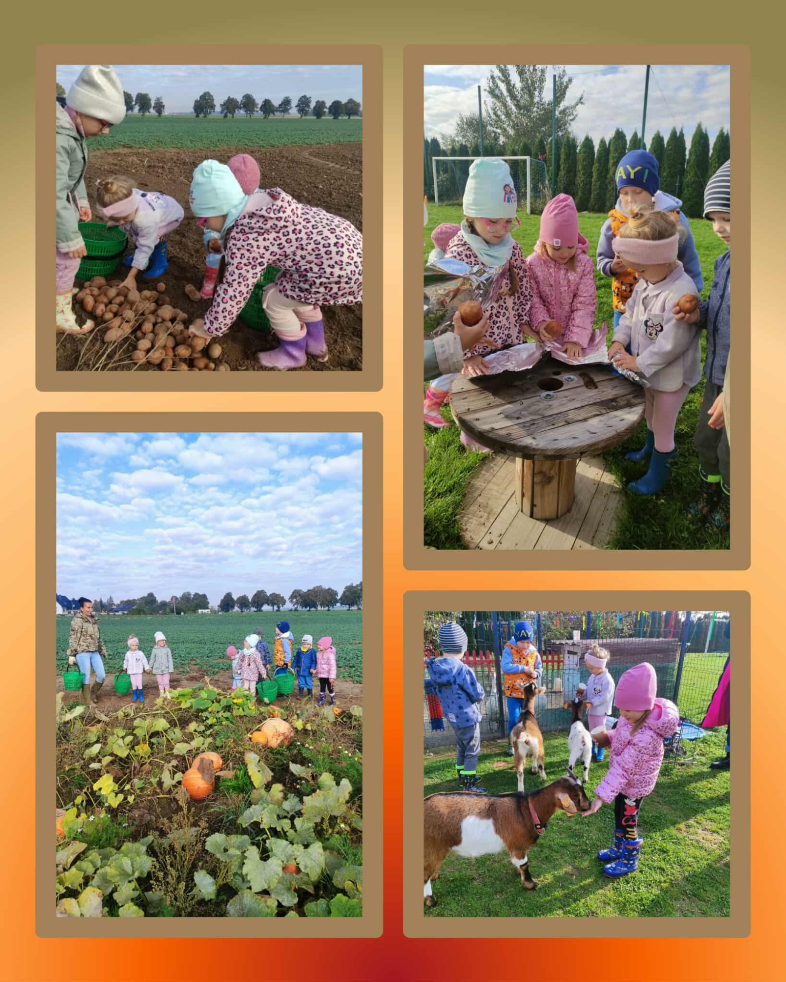 Dzisiaj odwiedziliśmy Kolorową Farmę i spędziliśmy wspaniały Dzień Ziemniaka. Dzieci własnoręcznie zbierały ziemniaki podczas wykopków, a potem z apetytem zajadały pieczone z ognisku. Był czas na karmienie kóz, kur i króliczków, na jesienne prace plastyczne oraz zabawę na placu zabaw. Ciepła herbatka i wata cukrowa były miłym dopełnieniem dnia pełnego radości i nowych doświadczeń.