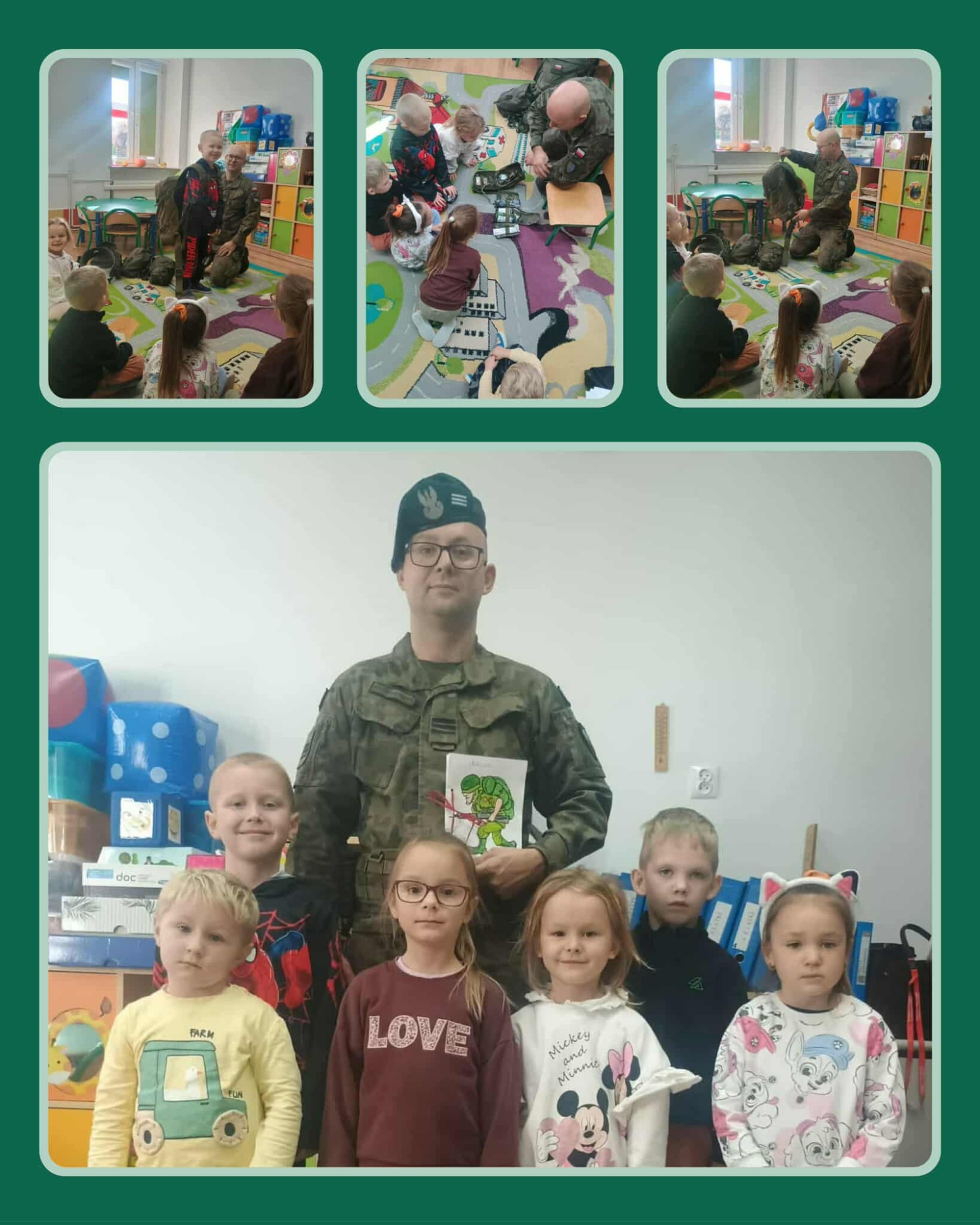 Dzisiaj w naszej grupie odbyło się wyjątkowe spotkanie z Panem Miłoszem, tatą Neli, który pracuje jako żołnierz. Dzieci mogły zobaczyć mundur polowy, dotknąć wybranych elementów wyposażenia i zapytać o to, jak wygląda codzienna służba. Rozmawialiśmy o bezpieczeństwie, odwadze i o tym, jak ważna jest praca osób, które dbają o nasz kraj. Przedszkolaki słuchały z dużym zaangażowaniem. Dziękujemy Panu Miłoszowi za obecność i cenny czas spędzony z dziećmi.